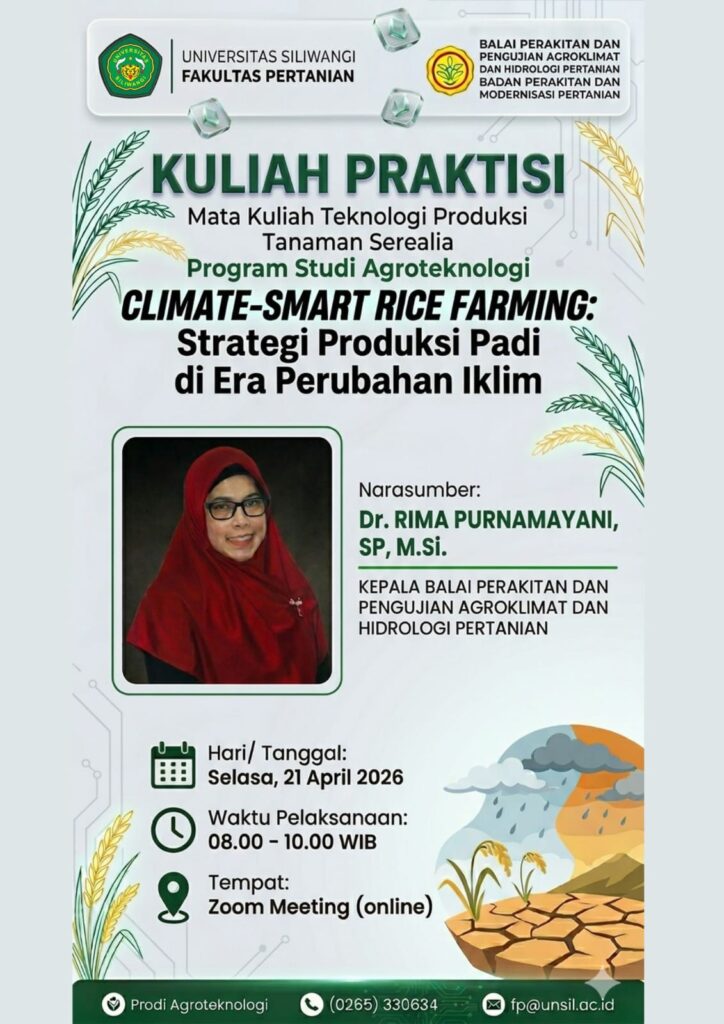 TASIKMALAYA – Program Studi Agroteknologi Fakultas Pertanian (FAPERTA) Universitas Siliwangi kembali menyelenggarakan kegiatan akademik inspiratif berupa Kuliah Praktisi pada hari Selasa (21/04/2026). Mengangkat tema mutakhir yakni “Climate-Smart Rice Farming: Strategi Produksi Padi di Era Perubahan Iklim”, perkuliahan ini diselenggarakan secara virtual melalui platform Zoom Meeting.
