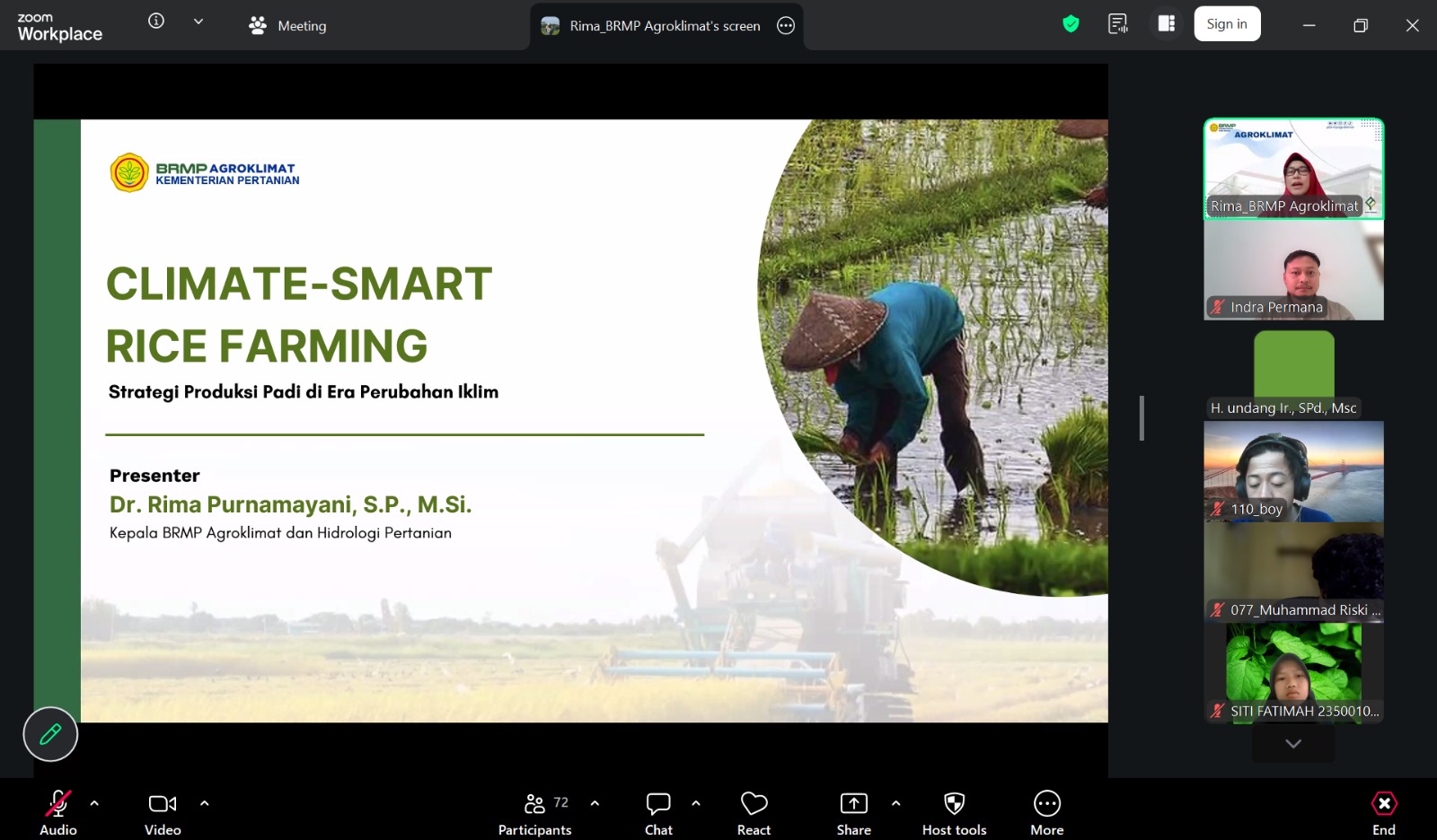 Dalam sesi pemaparannya yang berlangsung pukul 08.00 hingga 10.00 WIB, narasumber membedah berbagai strategi adaptasi dan mitigasi yang krusial bagi sektor pertanian dalam menghadapi tantangan perubahan iklim global. Pendekatan pertanian cerdas iklim (Climate-Smart Agriculture) ditekankan sebagai kunci utama untuk tetap menjaga produktivitas padi secara berkelanjutan sekaligus mengamankan ketahanan pangan nasional.