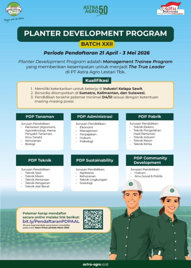TASIKMALAYA – Kabar gembira bagi para lulusan perguruan tinggi, khususnya alumni Fakultas Pertanian, yang bercita-cita membangun karir mapan di sektor perkebunan. PT Astra Agro Lestari Tbk., salah satu perusahaan perkebunan kelapa sawit terbesar di Indonesia, resmi membuka pendaftaran untuk Planter Development Program (PDP) Batch XXII.